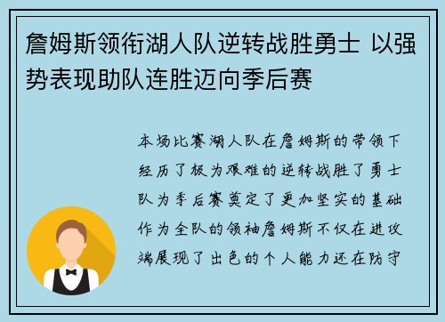 本场比赛,湖人队在詹姆斯的带领下,经历了...