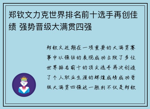 郑钦文近期在一项重要的大满贯赛事中,以强...