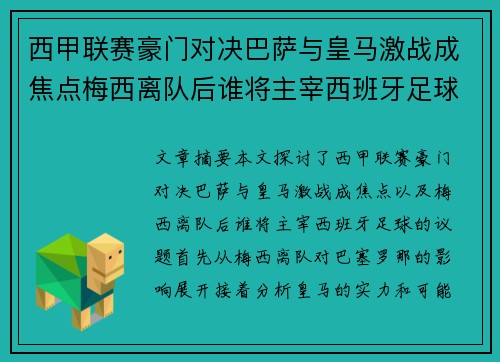 文章摘要:本文探讨了西甲联赛豪门对决巴萨...