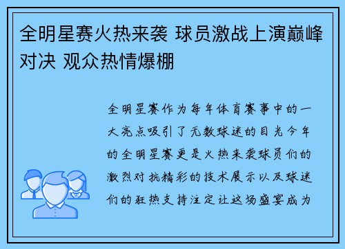 全明星赛作为每年体育赛事中的一大亮点,吸...