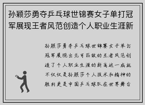 孙颖莎勇夺乒乓球世锦赛女子单打冠军,展现...